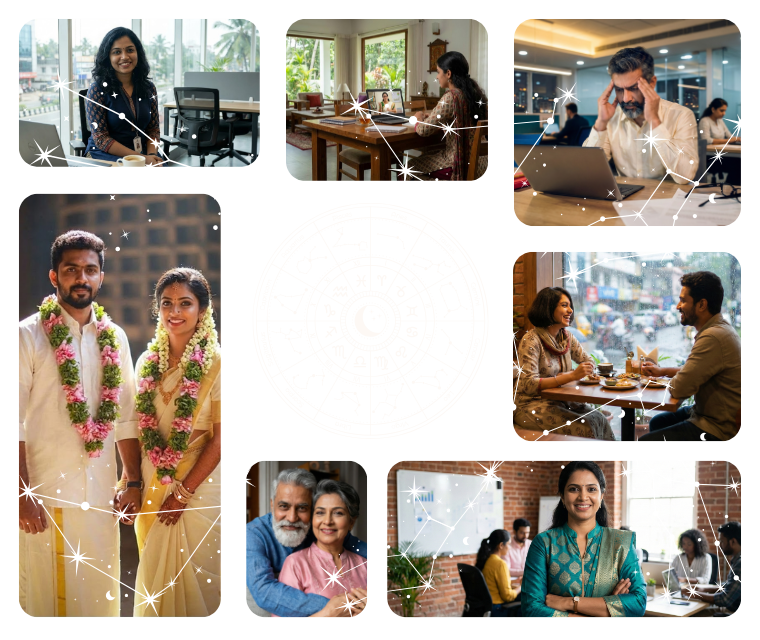 We offer personalized astrology services — from jathakam and porutham to career and muhurtham guidance — to clients across Kerala, metro cities in India, the Gulf (UAE, Qatar, Saudi), and Malayali communities around the world. Consultations are available online and in-person, in Malayalam, English, and Tamil.